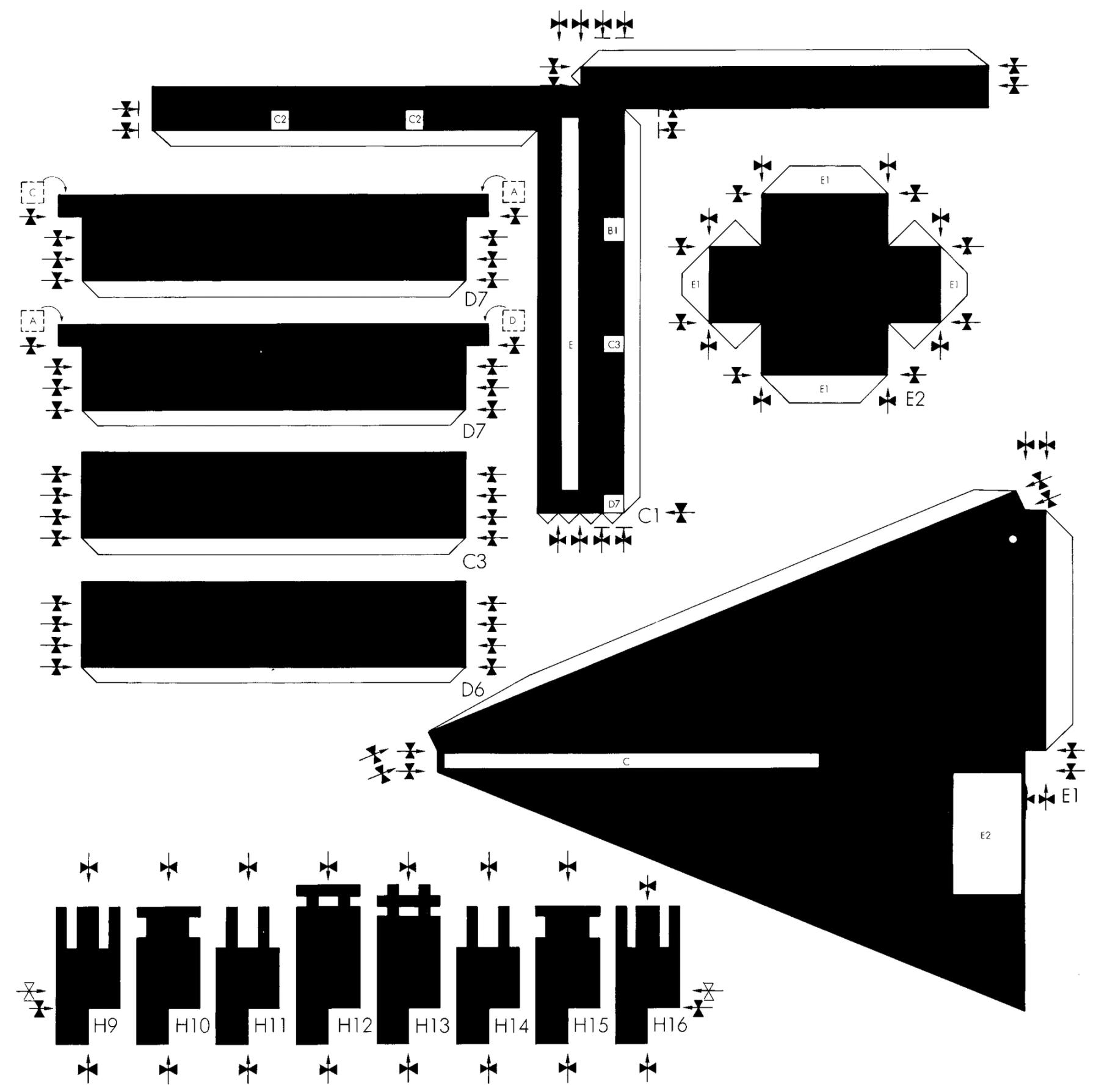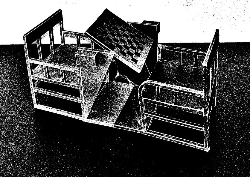 On one side was a small dismountable platform with a dais and a screen. A platform underneath could be pulled out and used for a play. The folding partition served as a “curtain’. Central was the reading table of which the side tops could be folded down. A small cabinet along the wall contained horizontally rotating, hexagonal cylinders on which photographs could be displayed. Finally, the chess table constituted a unit with the chairs which could be moved out of the way like a sleigh. The chessboard G could be tilted and the H players could only rise from their seats (and so resign the game) or sit down when the board was in a vertical position. All this furniture was made of wood, and just like the walls and furnishing, painted grey, red, black and white. The floor was black.