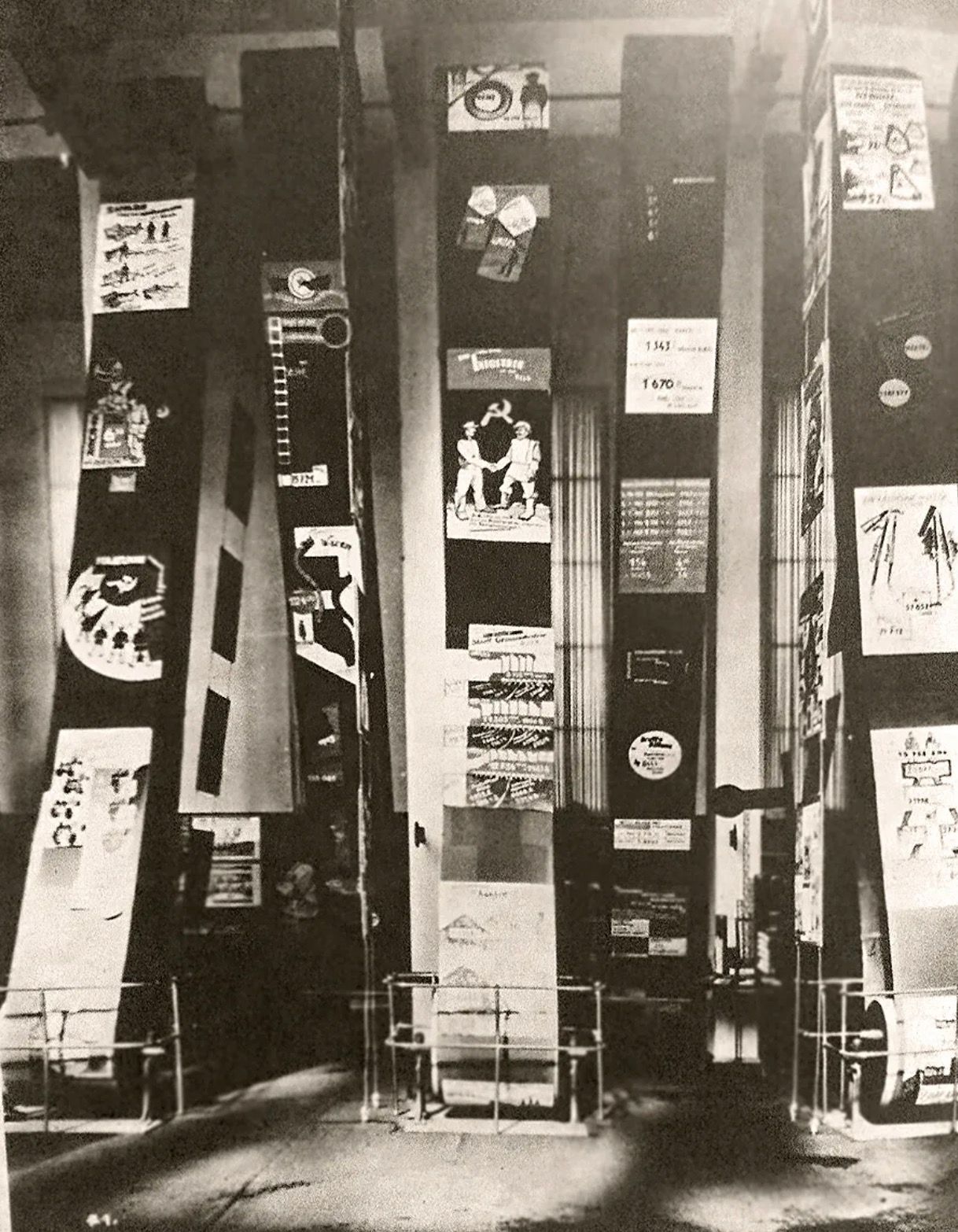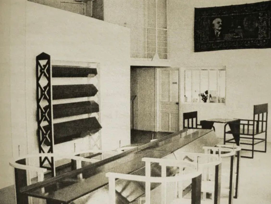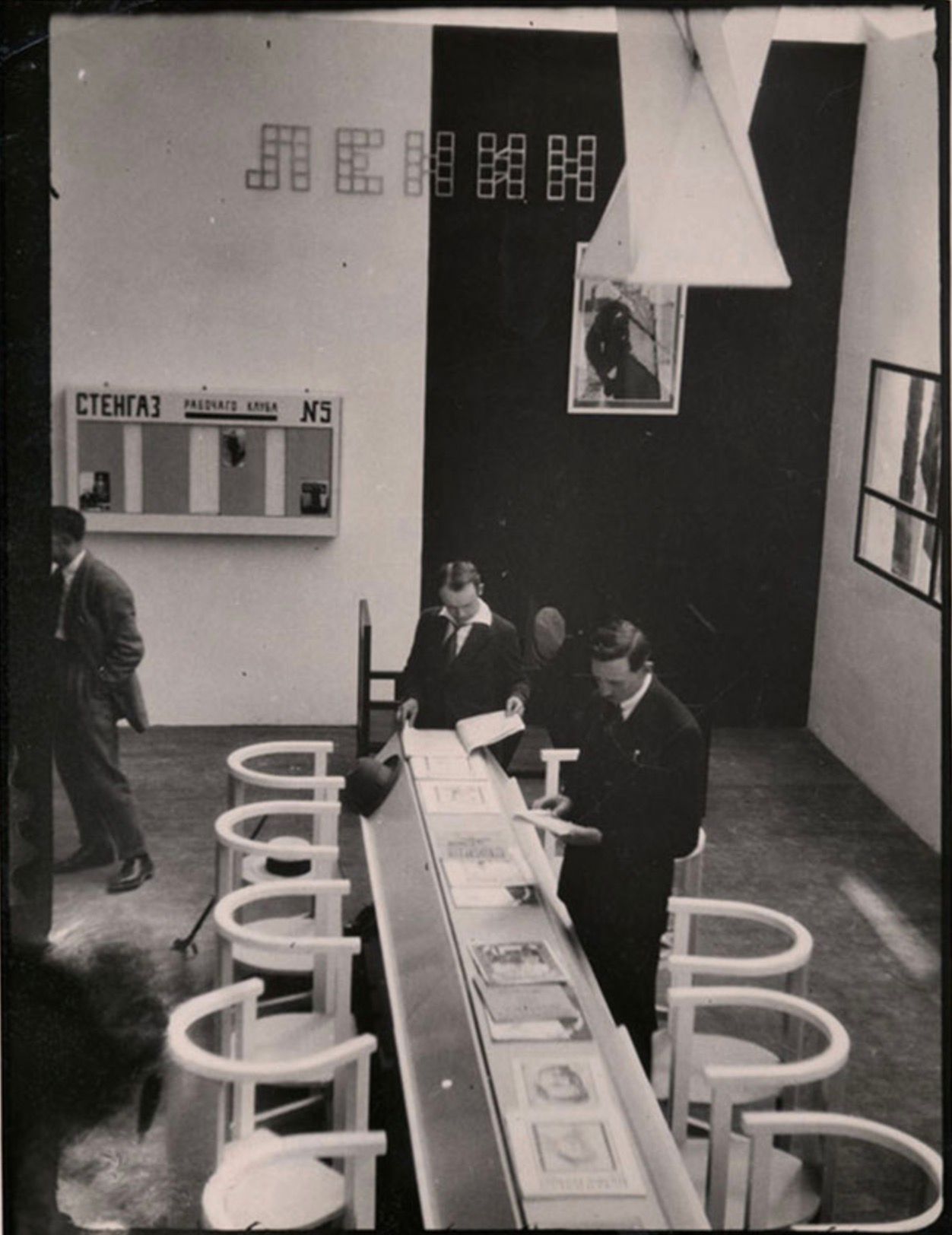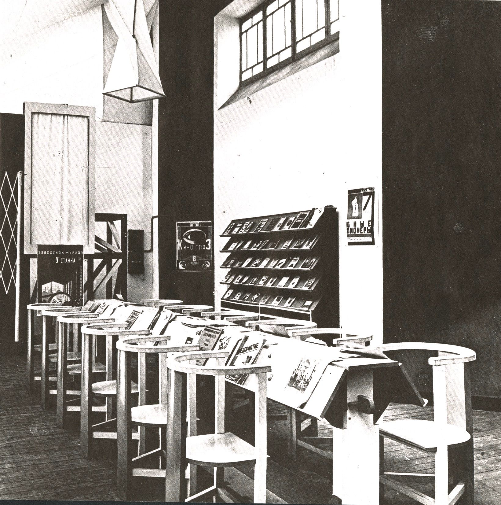 Rodchenko got the commission to design this Club (and the interior of the other rooms of the Soviet Union) through the poet Mayakovsky. They had met a few years previously and had made many bill boards and the like (Mayakovsky thought up the text Rodchenko did the design). Part of this work was exhibited in the Club together with other graphic work by Rodchenko and his first photographs.