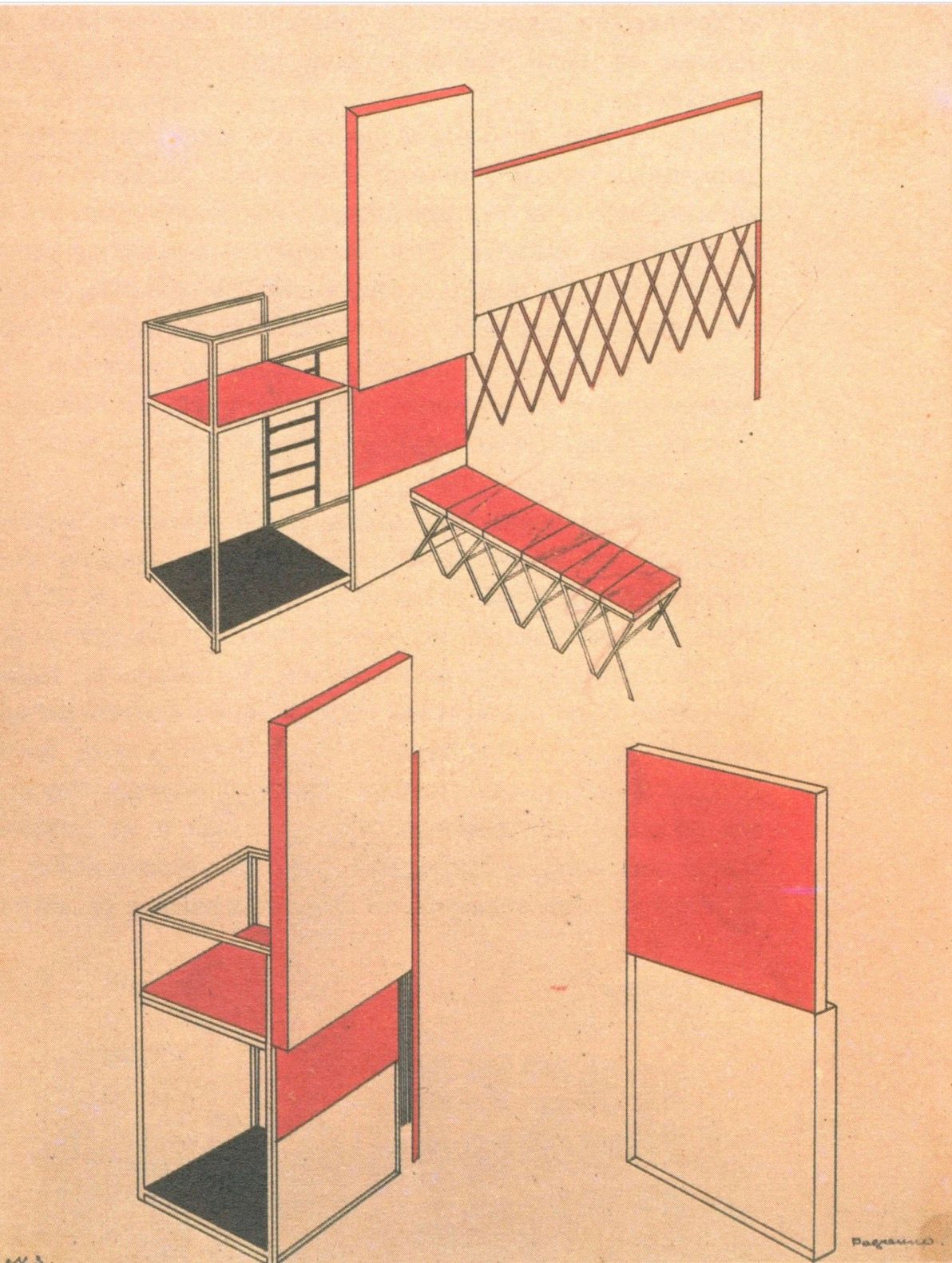 Starting out from these requirements, almost all the objects have been constructed according to a principle of mobility, making it possible to use each object and then replace it when no longer in use. In my opinion this is a principle which is typical of the production of modern objects. I have been working along these lines for five years in the Faculty of Metalwork of Vkhutemas and the last two years have shown that an object designed for its dynamism has a larger number of potential uses and is better suited to modern living conditions.