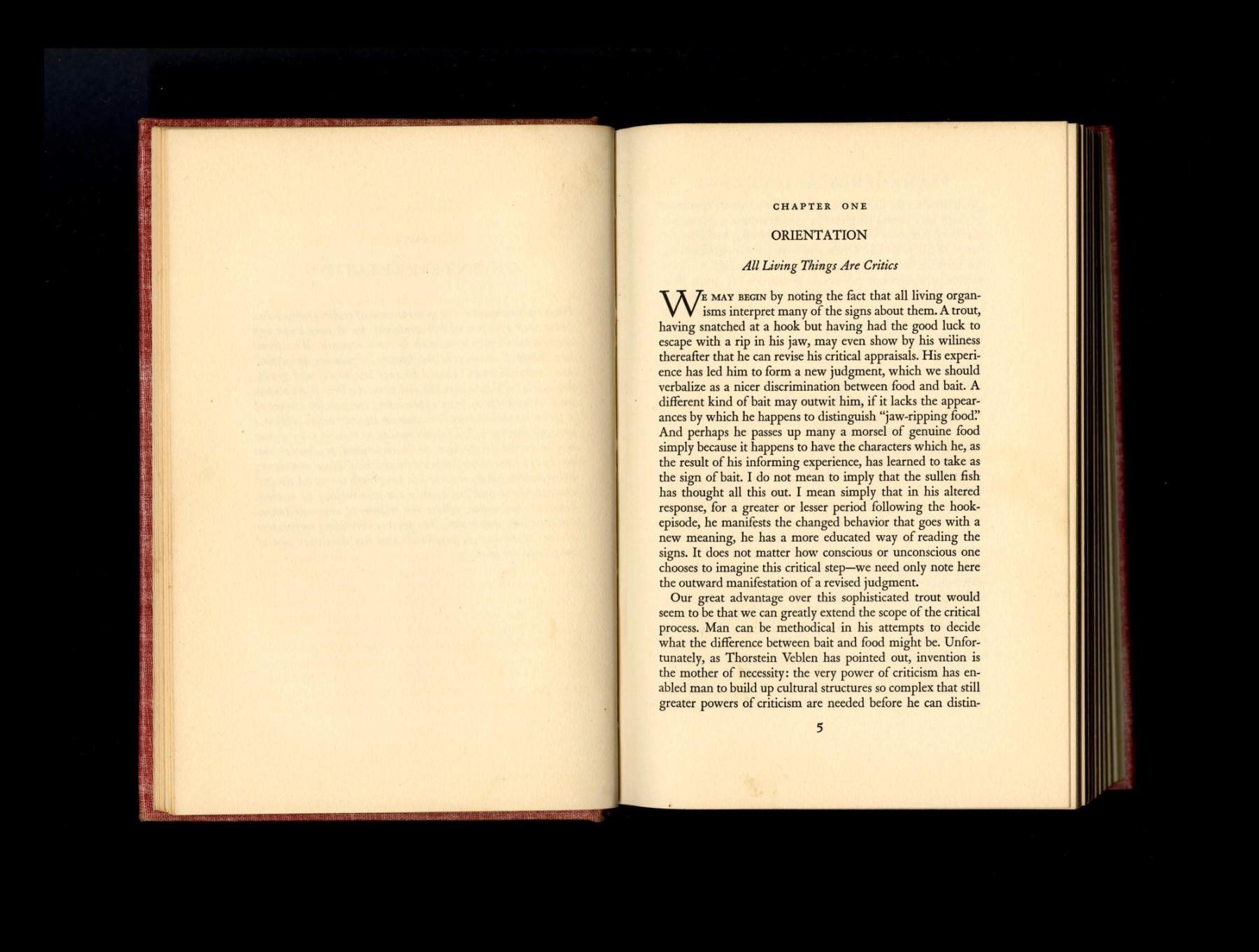 And perhaps he passes up many a morsel of genuine food simply because it happens to have the characters which he, as the result of his informing experience, has learned to take as the sign of bait. E I do not mean to imply that the sullen fish has thought all this out. I mean simply that in his altered response, for a greater or lesser period following the hook-episode, he manifests the changed behavior that goes with a new meaning, he has a more educated way of reading the signs. F It does not matter how conscious or unconscious one chooses to imagine this critical step — we need only note here the outward manifestation of a revised judgment.