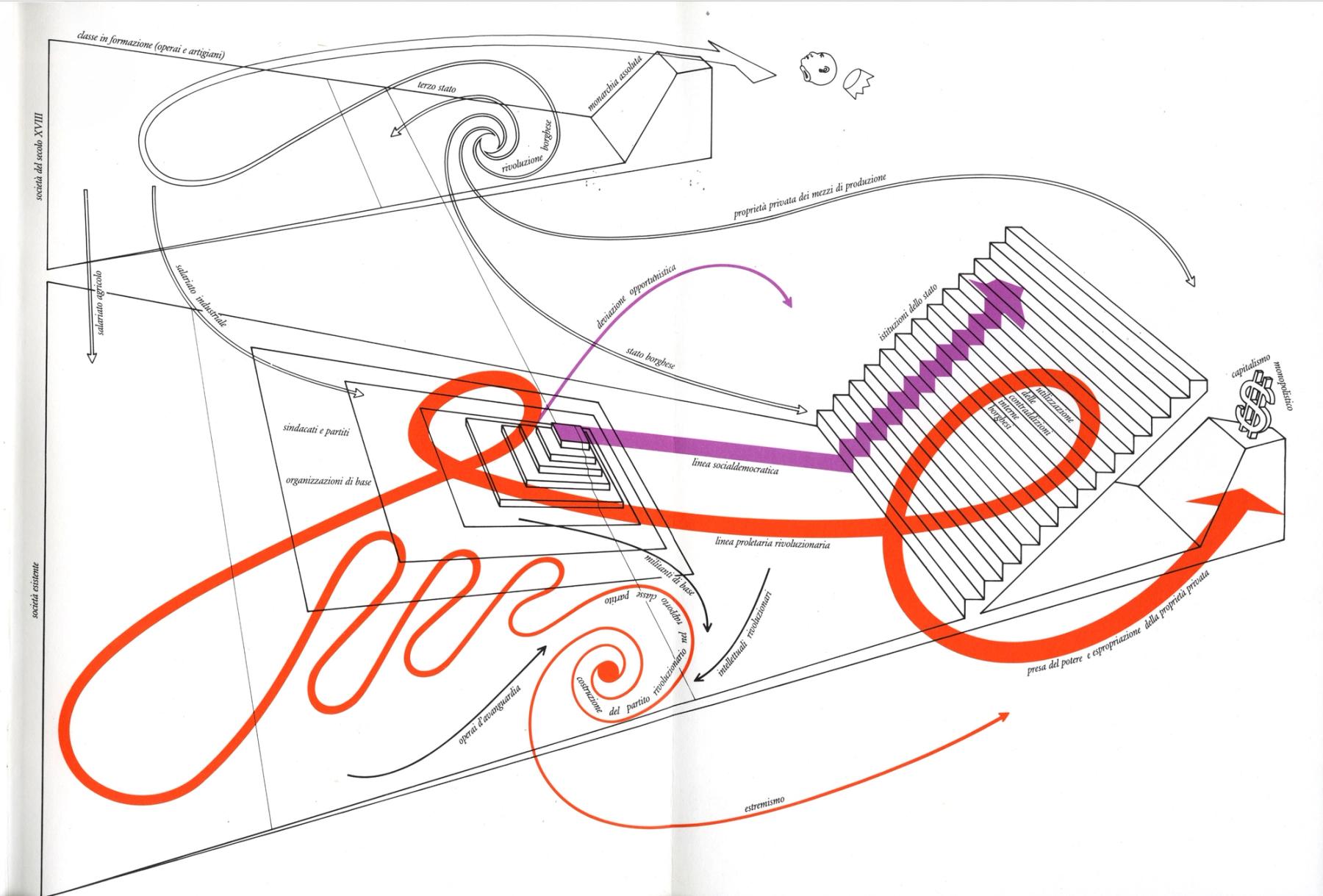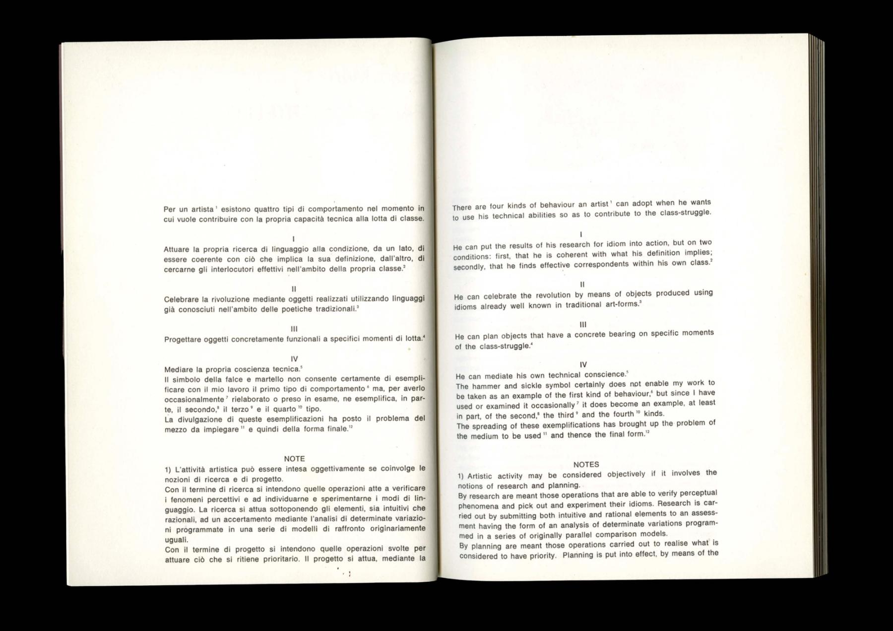 Such an objective may be approached in three very precise ways: → a) by operating politically inside one's own class so as to bring out its contradictions and mediate them as an effective contribution to the class-struggle; → b) by operating with one's own research and planning work so as to objectivize the so-called creative processes and thus to do away with the myth of the collective image — so functional to the ruling class — of the exceptionality of the individual. → c) by recognizing and singling out every moment in which the proletariat spontaneously constructs and uses its own idiom without being fully conscious of it since it is still conditioned by the myths of aristocratic culture. — EM