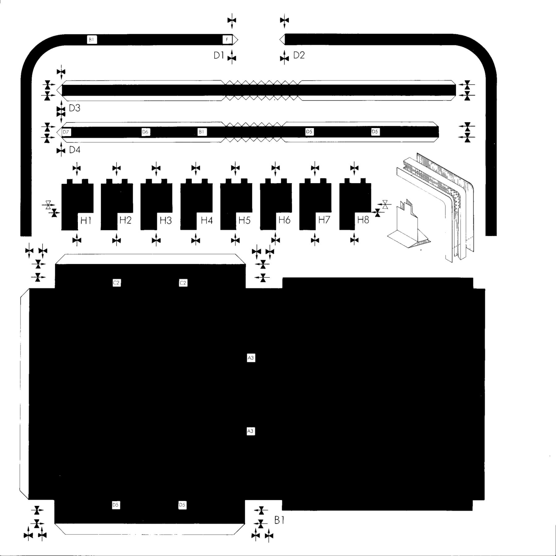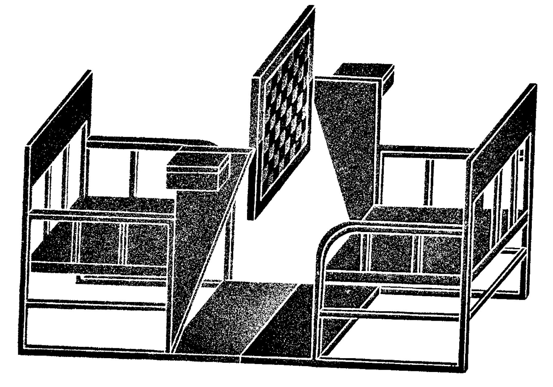 On one side was a small dismountable platform with a dais and a screen. A platform underneath could be pulled out and used for a play. The folding partition served as a “curtain’. Central was the reading table of which the side tops could be folded down. A small cabinet along the wall contained horizontally rotating, hexagonal cylinders on which photographs could be displayed. Finally, the chess table constituted a unit with the chairs which could be moved out of the way like a sleigh. The chessboard G could be tilted and the H players could only rise from their seats (and so resign the game) or sit down when the board was in a vertical position. All this furniture was made of wood, and just like the walls and furnishing, painted grey, red, black and white. The floor was black.